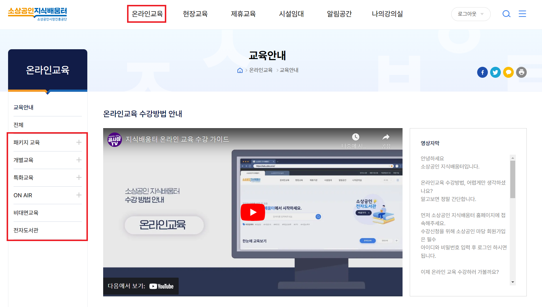 소상공인뿐만 아니라 새롭게 사업을 시작하려하는 예비 창업자, 또는 사업에 필요한 여러 가지 정보와 교육을 받고자 하는 일반인 모두에게 다양한 사업군에 대한 정보 및 온라인 교육을 무료로 지원하는 사이트입니다.
