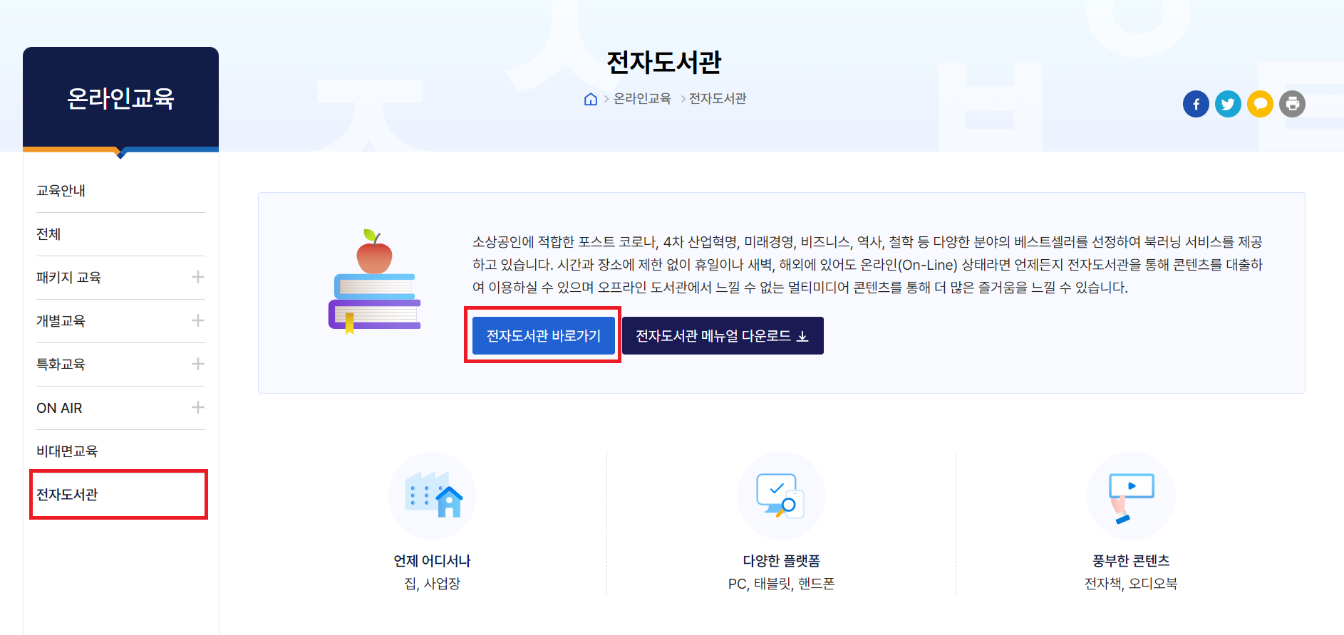 위 교육을 마쳤다면 아래 그림에 나오는 메뉴 중 전자도서관을 클릭하면 다음과 같은 화면이 나옵니다. 여기서 전자도서관 바로가기를 클릭하시면 교보문고에서 제공하는 e-book 및 오디오북을 대여할 수 있는 곳으로 이동합니다.