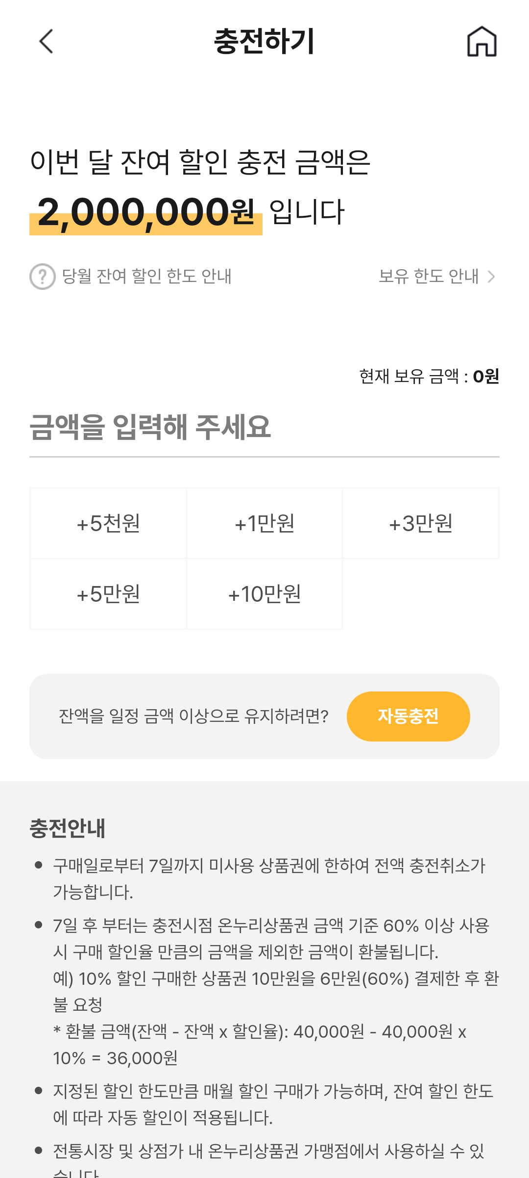4. 앱에서 원하는 금액만큼 온누리상품권을 충전해요.