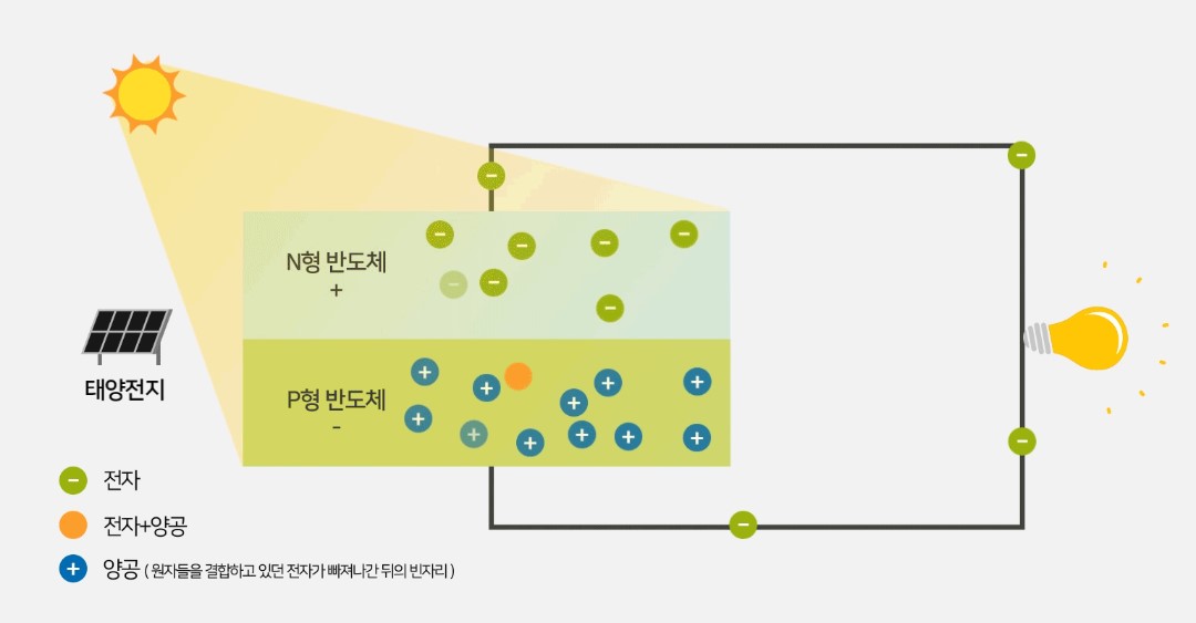 태양광(빛)이 태양전지에 도달하면, 광전효과로 인해 에너지가 만들어지고 이 에너지의 영향을 받아 전자와 정공이 생성됩니다. 특히, n-형 반도체에서 에너지를 받아 활성화된 전자들이 pn 접합을 건너 p-형 반도체로 이동하게 되고, 이 과정에서 전류가 발생합니다.