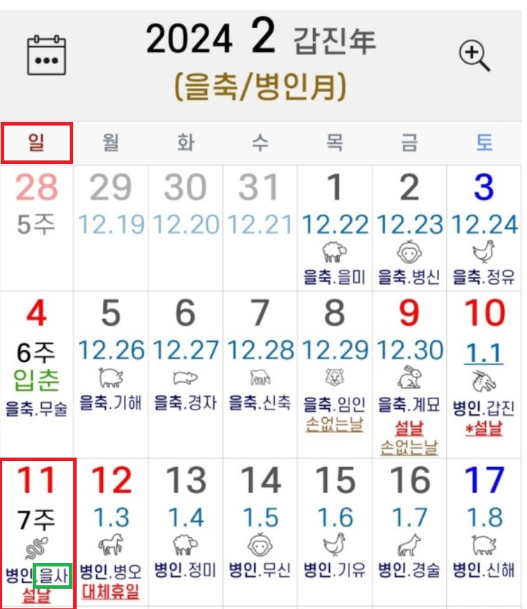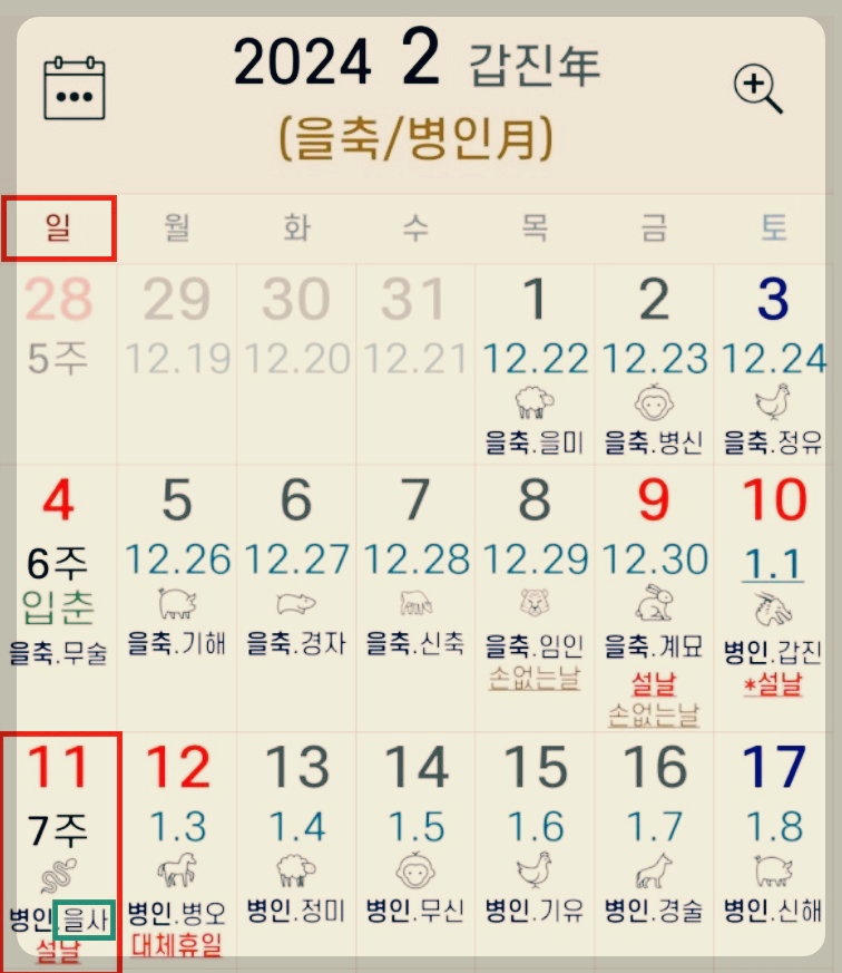 위의 달력에 빨간색으로 표시한 박스가 보이시죠? 일요일 맨 아래 11일을 보시면 육십갑자 중에 사에 해당하는 일입니다. 위 복단일 찾는 방법에 일요일을 보시면 자와 사가 일요일과 겹치면 그날이 복단일이라 했습니다.