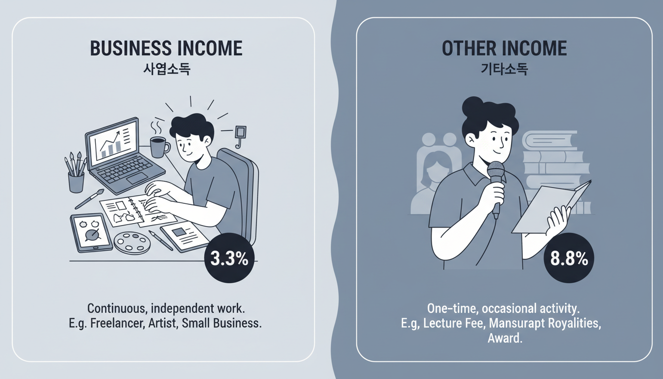 | 원천징수율 | 3.3% | 8.8% (필요경비 차감 후 과세) |